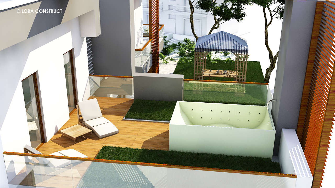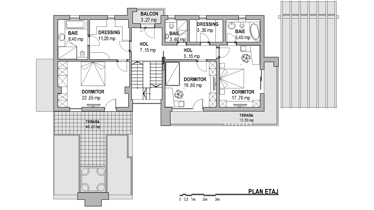 Etajul este alcatuit din 2 terase, una de peste 45 de MP si o alta terasa ceva mai restransa, de aproximativ 13 MP dar si din 3 dormitoare decomandate, fiecare dintre acestea avand acces catre o baie proprie. Totodata, la nivelul etajului, avem parte de 2 incaperi pe care le puteti folosii ca si dressing-uri dar si de un balcon la capatului holului.