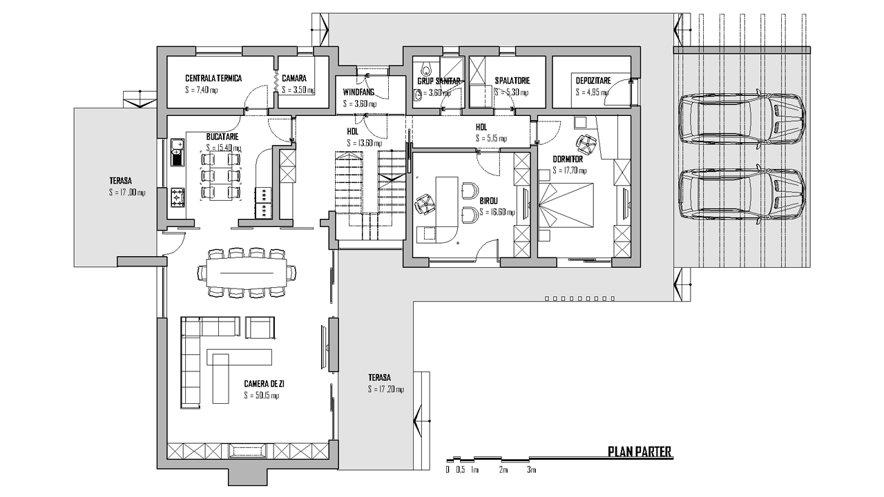 Proiectul dispune de un parter segmentat intr-un living incapator, de peste 50 de MP, o bucatarie in stil american de aproximativ 15 MP dar si de  2 camere care pot fi folosite drept dormitoare sau chiar birouri. Tot la parter regasim camere de mici dimensiuni care pot fi folosite drept spatii de depozitare, spatiu pentru centrala termica sau chiar pentru baie sau spalatorie. Totodata, proiectul ne ofera doua terase de peste 17 MP fiecare si holuri extrem extrem de incapatoare, cu acces spre etaj.