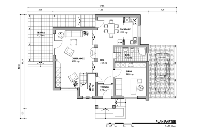 Inainte de a pasii catre parter, o sa mentionam prezenta unui loc de parcare acoperit, ideal pentru masina personala. Odata patrunsi la interior, descoperim un hol generos care ne conduce catre principalele incaperi. Avem parte de o bucatarie deschisa, de peste 15 mp, un birou de aproximativ 14 mp, de o baie comuna, de o debara dar si de camera de zi de peste 30 de mp, aceasta oferindu-ne acces catre o terasa superba cu suprafata de peste 20 de mp.
